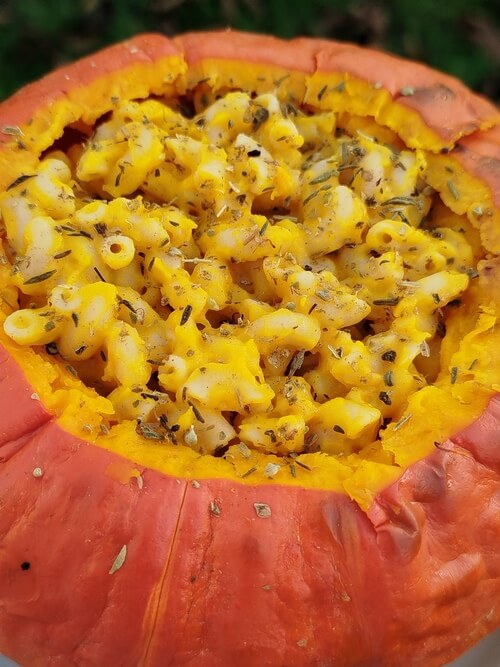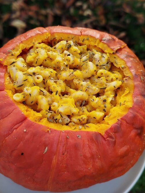 Ajouter les pâtes égouttées à la sauce et server votre plat de coquillettes dans votre coque de potimarron.