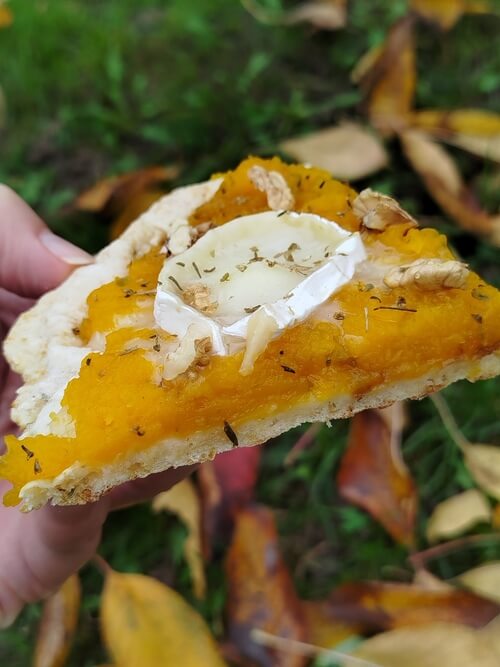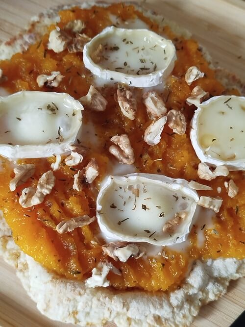 Une fois vos pinsa cuites, garnissez les avec les dés de butternut préalablement écrasés et assaisonnés (sel, poivre, zaatar…).